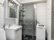 Varustus: suihkuseinä, pesukoneliitäntä, lattialämmitys, wc-istuin, suihku, peilikaappi, kiinteät valaisimet, kylpyhuonekaapisto.