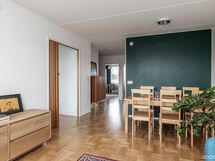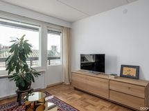 Kodin keittiö ja makuuhuone sijaitsevat sisäpihan puolella. Keittiössä hyvin tilaa ruokapöydälle ja reilusti kaappitilaa. Toiseen suuntaan avautuu iso olohuone ja toinen asunnon makuuhuoneista. Olohuoneesta kulku lasitetulle etelänpuoleiselle lasitetulle parvekkeelle. Olohuoneessa, makuuhuoneissa ja eteisessä kaunis, uusittu parkettilattia. Kylpyhuoneessa on oma sauna, ja säilytystiloja löytyy runsaasti, mukaan lukien vaatehuone ja makuuhuoneessa sijaitseva liukuovikaapisto.