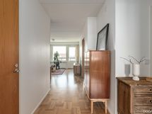 Köket och sovrummet är belägna mot innergården. I köket finns gott om plats för matbord samt bra med skåputrymme. I ena endan av lägenheten finns ett stort vardagsrum och ett sovrum. Vardagsrummet har utgång till den inglasade balkong mot söder. Vackert renoverat parkettgolv finns i både vardagsrum, sovrum och hall. I badrummet finns en egen bastu. Det finns gott om förvaringsutrymme, inklusive en klädkammare och garderob med skjutdörrar i sovrummet.