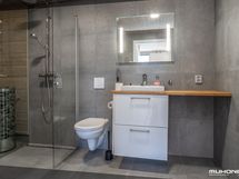 Pesutilojen varusteet: WC-istuin, suihku, pesukoneliitäntä, lattialämmitys, peilikaappi ja suihkuseinä. Pesutilojen kuvaus: Isot lattialaatat
