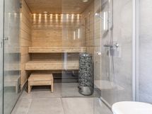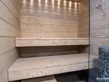 Kiuas: Sähkökiuas. Lasiseinä sekä tyylikkäät leveät lankkulauteet.