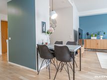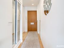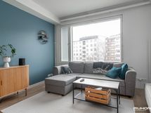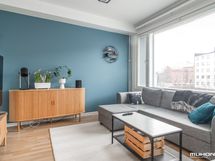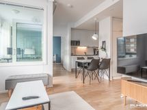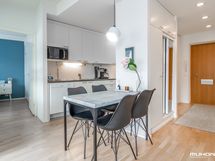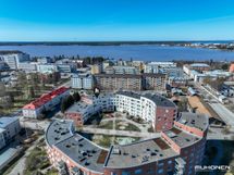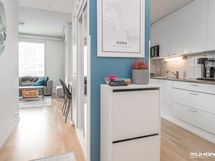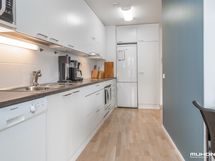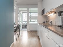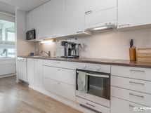 - Keittiön varusteet: Jääkaappipakastin, uuni, liesi, liesituuletin ja astianpesukone. Työtason materiaali: Laminaatti.