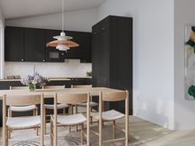 Keittiön varusteet: Jääkaappipakastin, jääkaappi, astianpesukone, erillisuuni ja liesituuletin. Liesi: Induktioliesi. Työtason materiaali: Laminaatti. Avokeittiö, erittäin korkeatasoinen varustelu. Välittäjältä saat virallisen esitteen.