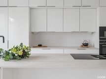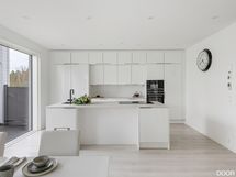 Sisään tullessa huomio kiinnittyy kodin avaruuteen ja valoon. Olohuone ja keittiö muodostavat yhtenäisen tilan, jossa korkea huonekorkeus ja suuret ikkunapinnat tuovat runsaasti luonnonvaloa. Keittiö on suunniteltu käytännölliseksi, mutta toimii luontevasti myös kodin keskipisteenä arjen ja yhteisten hetkien äärellä.