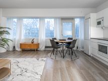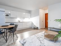 - Työtasot: laminaatti. Tyylikäs, tilava keittiö olohuoneen yhteydessä. Täysin remontoitu vuonna 2022. Induktioliesi, liesituuletin, jääkaappi, pakastin, integroitu astianpesukone, mikroaaltouuni.