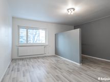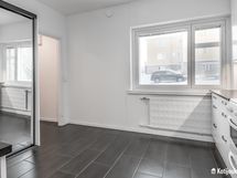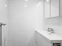 Olohuoneessakin neliöitä piisaa, ja tila on jaettu pienellä väliseinällä mikä antaa vaikutelman kahdesta erillisestä huoneesta. Vaatesäilytyksestä vastaa mukavan kokoinen liukuovikaappi. Kodin kylpyhuone on kompakti kooltaan ja sinne mahtuu sopivasti juuri kaikki tarvittava, myös pyykkihuollolle on tilansa.