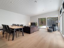 Olohuone ja keittiö ovat yhtenäistä avointa tilaa, ja suuret ikkunat tuovat runsaasti luonnonvaloa huoneeseen. Takapihalta näkymät metsän suuntaan, suojaisa piha.