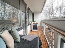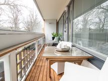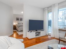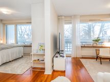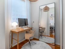 - Suojaiset, vehreät näkymät länteen taloyhtiön puistomaiselle piha-alueelle ja Kasarminalueelle (olohuone, makuuhuone) ja itään Raastuvankadulle (keittiö, työtila).