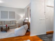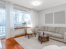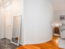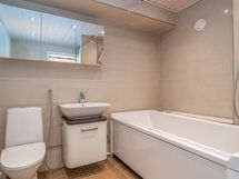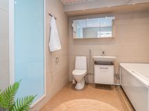 - Pesutilojen kuvaus: Erittäin tyylikäästi suurennettu ja remontoitu kylpyhuone, missä erillinen kodinhoitotila. Kylpyamme. Kylpyhuoneen ja olohuoneen välissä iso, maitolasinen ikkuna antaa luonnonvaloa kph:een.