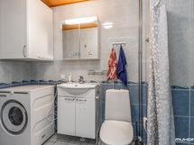 Pesutilojen varusteet: WC-istuin, suihku, pesukone, pesukoneliitäntä, peilikaappi, pesuallas ja allaskaappi.