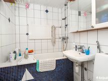 - Pesutilojen kuvaus: Kylpyhuone sijaitsee makuuhuoneiden välittömässä läheisyydessä. Varustus: kylpyamme, wc-istuin, suihku.