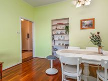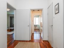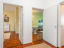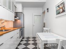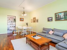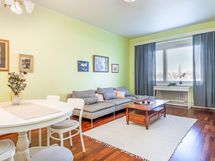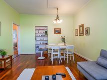 Keittiöön mahtuu pieni pöytä - tilavassa olohuoneessa tilaa ruokailuryhmälle.