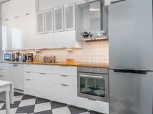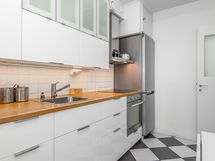 - Työtasot: puu. Kaunis, remontoitu, valkoinen keittiö. Jääpakastinkaappi, keraaminen liesi, liesituuletin, erillisuuni, astianpesukone.