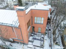 Huset är ritat av de uppskattade arkitekterna Aitoaho & Viljanen. De varma tonerna och eleganta detaljerna andas sydeuropeisk charm som kompletteras av en vacker gårdsplan.