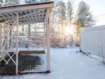 Suojaisalle takapihalle on kulku olohuoneesta. Pihassa on niin terassi kuin katettu pergolakin kauniista kesäpäivistä nauttimiseen.