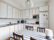 Keittiöstä on kaikki tarvittava ja sinne mahtuu lisäksi isompikin ruokapöytä.