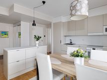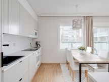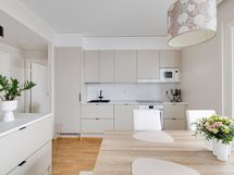 - Keittiön varusteet: Jääkaappi, erillinen pakastin (kodinhoitohuoneessa), erillisuuni, keittiösaareke ja astianpesukone. Liesi: Induktioliesi. Greigen värinen kiva keittiö.