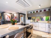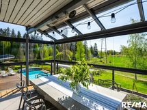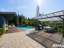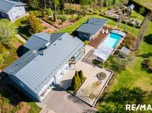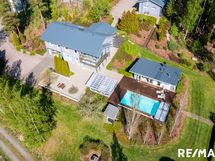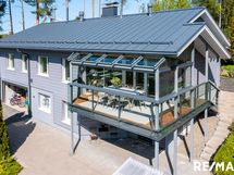 Tämä upeus on alkujaan vuodelta 1988 ja sitä on laajennettu 1993 ja 2015. Asuinneliöitä on kaikkineen 220 m2, joista yläkerrassa 140 m2 ja alakerrassa 80 m2. Lisäksi on vuonna 2015 valmistunut talviasuttava "beach house" noin 33 m2, jossa on valoisa tupakeittiö, wc ja sauna sekä valtavan kokoinen patio sekä 4 x 8 m kokoinen katettu uima-allas.