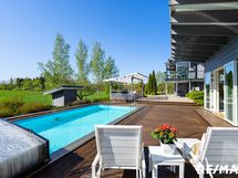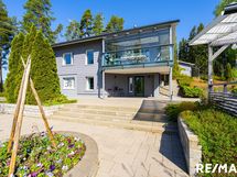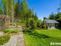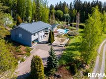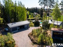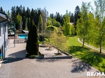 Valtava 5090 m2 puutarhatontti suuntautuu etelään. Runsaat istutukset on valittu harkiten ja hoidettu rakkaudella. Pihassa on kasvihuone, nyt ihastuttavana lepopaikkana. Kiveyksiä on niin etu- kuin alapihalla. Löytyy useampi paikka istahtaa kahville aurinkoon tai syömään katettuun pergolaan. Auringossa voit löhöillä "beach housen" valtavalla patiolla uima-altaan vieressä. Altaaseen voi pulahtaa myös pitkin talvea ja nauttia siis avannosta omassa pihassa. Yläpihalla on vuonna 2015 valmistunut talousrakennus, jossa on iso autotalli leveällä nosto-ovella, kahdelle autolle katospaikka ja iso lämmin varasto. Rakennuksen takana vielä 10 m2 puuvarasto.