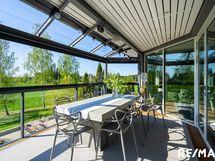 Sisääntulo on valoisalle lasiterassille, jossa osa lasilattiaa ja sen kautta näkyy alakerran oleskelutila/ "viinikellari". Talon yläkerrassa on kolme isoa makuuhuonetta, joista yhdessä on oma wc. Lisäksi erillinen wc. Avara keittiö - ruokailutila - olohuone, josta näkymät kauniiseen peltomaisemaan ja puutarhaan. Keittiössä on mm. betoniset työtasot, laadukkaat integroidut kodinkoneet ja käynti isolle lasiterassille. Eteisessä ja olohuoneen seinässä Norjan Altan luonnonkiveä. Lattiamateriaalina yläkerrassa on kivi ja massiivitammilankku.
