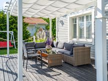 Etupihan aurinkoinen terassi ja yläkerran parveke ovat verrattomia paikkoja nautiskella kesäilloista.