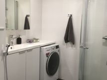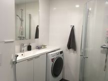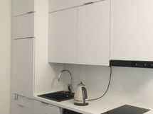 Asunto sijaitsee sisäpihan puolella eli ikkunat eivät ole junaradalle päin ja tämä vaikuttaa myös matalaan melutasoon. Korkeissa ikkunoissa on sälekaihtimet. Asunnossa on vaaleat laminaattilattiat, kattoon upotetut valaisimet eteisessä ja kaapiston edessä sekä runsaasti kaappitilaa (mm. avokeittiössä leveä yläkaappi, kylpyhuoneessa kattoon asti ulottuva kaappi seinäwc:n yläpuolella; tämän kaapin sisällä myös pistorasia esim. hiustenkuivaajalle). Avokeittiössä on pehmeästi sulkeutuvat laatikostot, musta kivikomposiittiallas, Gustavsbergin hana ja integroidut Whirlpoolin kodinkoneet: astianpesukone, jääkaappi-pakastin, mikron ja uunin yhdistelmä sekä 2-levyinen induktioliesi ja Swegon Casa -liesituuletin. Kylpyhuoneessa on kuivaava LG:n pyykinpesukone, iso peilikaappi, kaarevat suihkuovet, tyylikkään valkoinen alakatto (MDF), Gustafsbergin hana ja suihkusetti sekä Villeroy & Bochin/ Gustavsbergin seinäwc.