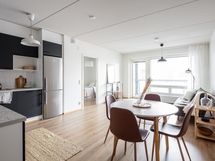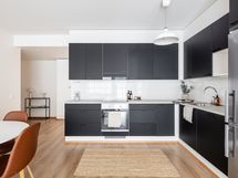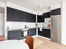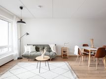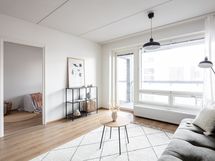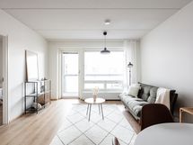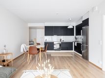 Keittiö on L-mallinen ja avautuu osaksi olohuonetta, muodostaen yhtenäisen ja avaran oleskelutilan. Keittiössä on astianpesukone ja reilusti työskentelytilaa, mikä tekee ruoanlaitosta sujuvaa ja mukavaa. Olohuoneessa on tilaa suuremmallekin ruokailuryhmälle, ja silti jää hyvin tilaa rentoutumiseen. Olohuoneesta on käynti suurelle lasitetulle parvekkeelle, joka toimii lisähuoneena keväästä syksyyn ja tuo kotiin lisää viihtyisyyttä.