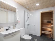 Kylpyhuoneessa on varaus pyykinpesukoneelle ja kuivausrummulle sekä tilaa lisäsäilytykselle, kuten kaapille tai hyllylle.