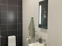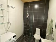 Suihku, Suihkuseinä, Pesukonevalmius, Allaskaappi, Laattalattia, Halogeenivalot, Laattaseinä