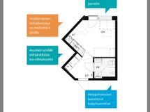 Myynnissä 23 neliöinen yksiö keskeiseltä paikalta Kivistöstä. Asunnossa on iso ikkuna rauhalliselle sisäpihalle päin sekä ranskalainen parveke. Normaalia korkeampi huonekorkeus tuo asuntoon tilantuntua ja valoa. Yksiön pinnat ovat pääosin vaaleita, mutta kylpyhuoneessa on musta tehosteseinä tuomassa kontrastia. Lattia on tammiparkettia. Asunnossa on lattialämmitys (kaukolämmöllä), joten patterit eivät ole sisustuksen tiellä.