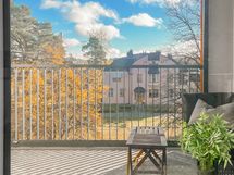 Näkymä suojeltuun puistoon neljännessä kerroksessa josta koko asunnon levyiseltä lasitetulta parvekkeelta on mukava seurata vuodenajan vaihtelua. Puiston takana ovat juuri saneeratut 1900 luvun alussa rakennetut kauniit asuinrakennukset.