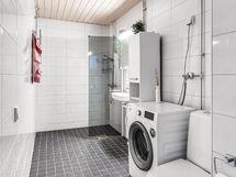 - Suihku, kääntyvä suihkuseinä,, peilikaappi, pesukoneliitäntä, kylpyhuonekaapisto, pyyhekuivainpatteri, kiinteät valaisimet