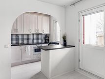 - Jääkaappi, keraaminen liesi, uuni, liesikupu/-tuuletin, työtasot laminaatti