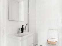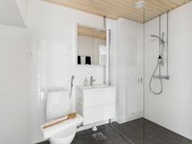 - Varustus: suihkuseinä, pesukoneliitäntä, lattialämmitys, wc-istuin, peilikaappi, kiinteät valaisimet. Varustus: lattialämmitys, bidee-suihku.