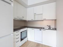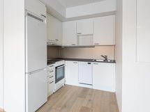 Keittiö on hieman erillään syvennyksessä ja siellä on hyvin lasku- ja kaappitilaa. Ruokapöydälle löytyy oma paikka olohuoneen yhteydessä.