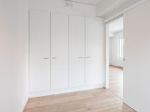 Makuuhuoneeseen pääsee kahdesta eri liukuovesta ja siellä on hyvin kaapistoja tavaroiden säilytykseen.