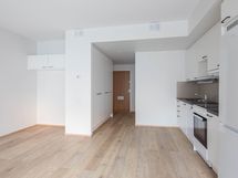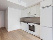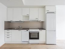 Keittiö on yhtenäistä tilaa olohuoneen kanssa ja ruokapöydälle / työpöydälle löytyy oma paikka olohuoneen yhteydessä esimerkiksi ikkunan alta.