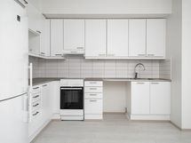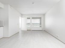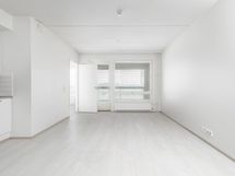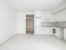 Tässä toimivapohjaisessa asunnossa keittiö on omassa kulmauksessaan ja yhdistyy olohuoneeseen. Tilaa on niin kokkailulle, ruokailulle kuin oleskelullekin, ja astianpesukoneelle on liitännät ja tilavaraus. Lattiat ovat vaaleaa laminaattia ja toimivat hyvänä pohjana omannäköiselle sisustukselle.