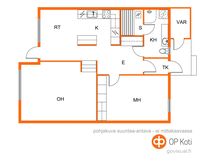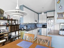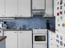 - Jääkaappipakastin, sähköliesi, liesituuletin, astianpesukone, kaapistot, kiinteät valaisimet kaapistojen alla. Työskentelytasot laminaattia, välitila laattaa.
