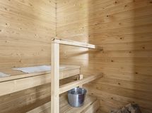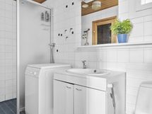 - Sauna, sähkökiuas, kylpyhuone wc-istuin kylpyhuoneessa, suihku, suihkuseinä, peilit, allaskaappi, pesukoneliitäntä, lattialämmitys, kiinteät valaisimet peilin yläöpuolella. Saunanoven ikkuna on aavistuksen pois paikaltaan. Löylyt ei siitä kuitenkaan karkaa.