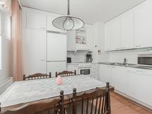 - Työtason materiaali: Kivi ja teräs. Kaapistot, tasot, jääkaappi/pakastin, keraaminen liesi, liesituuletin, astianpesukone. Välitila: Kaakeli.