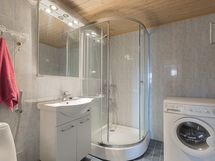 - Pesutilojen kuvaus: Lattialämmitys, suihku, suihkukaappi, peilikaappi, wc-istuin, allaskaappi, bidee, patteri, pesukoneliitäntä, kaappi.