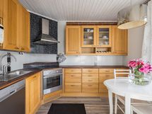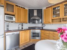 - Liesi: keraaminen. Työtasot: puu. Kylmäsäilytys: jääkaappi/pakastin. Varustus: astianpesukone, kiinteät valaisimet, liesituuletin / hormi. Keittiön kaapistot puuta