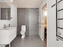 - Suihku ja kääntyvä suihkuseinä, pesukoneliitäntä, lattialämmitys, kylpyhuonekaapisto, peilikaappi, sauna
