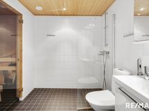 - Pesutilojen varusteet: WC-istuin, suihku, suihkuseinä, pesukoneliitäntä, pesuallas, allaskaappi, peilikaappi ja bidee-suihku.