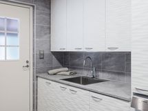 Kodinhoitohuoneessa kuraeteinen, kaapistot, pesuallas, pesukoneliitäntä, työtasot laminaattia, välitila laatoitettu, käynti ulos.