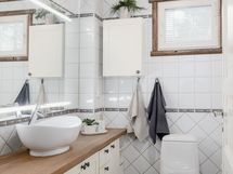 Alakerta erillinen wc: ikkunallinen tila, pesuallas-allaskaapit, peili, wc-istuin, tasot puuta, lattialämmitys.