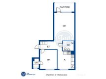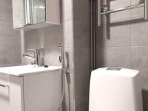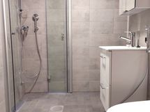 - Varustus: suihkuseinä, pesukoneliitäntä, lattialämmitys, wc-istuin, suihku, peili, kylpyhuonekaapisto.