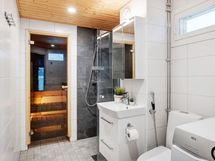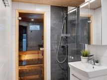 - Sauna. sähkökiuas, kylpyhuone, suihku, suihkuseinä, allaskaappi, pesukoneliitäntä, peili, lattialämmitys kph:ssa.