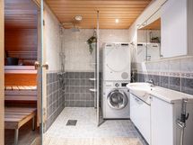 - Varustus: suihkuseinä, pesukoneliitäntä, wc-istuin, suihku, peilikaappi, kiinteät valaisimet.